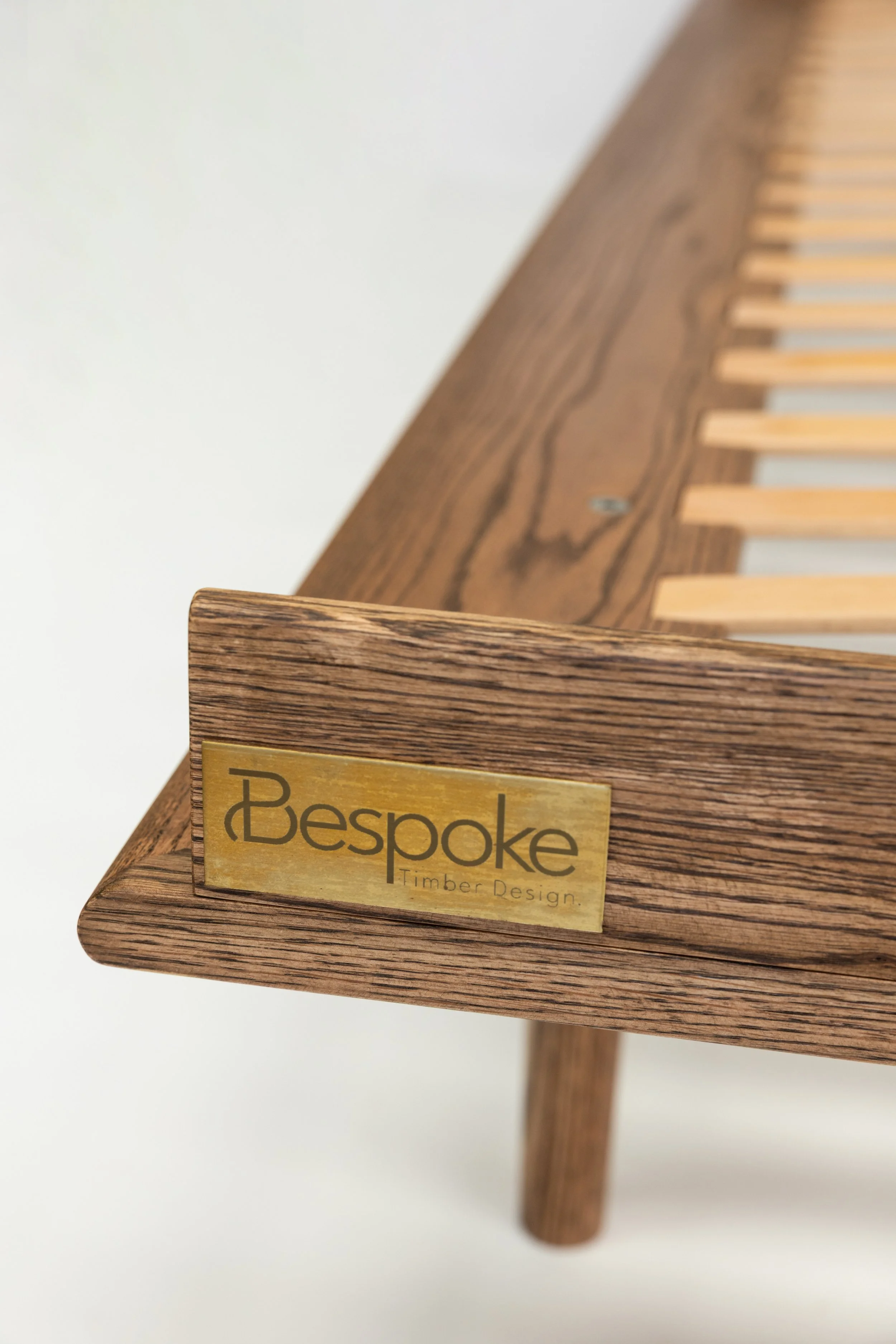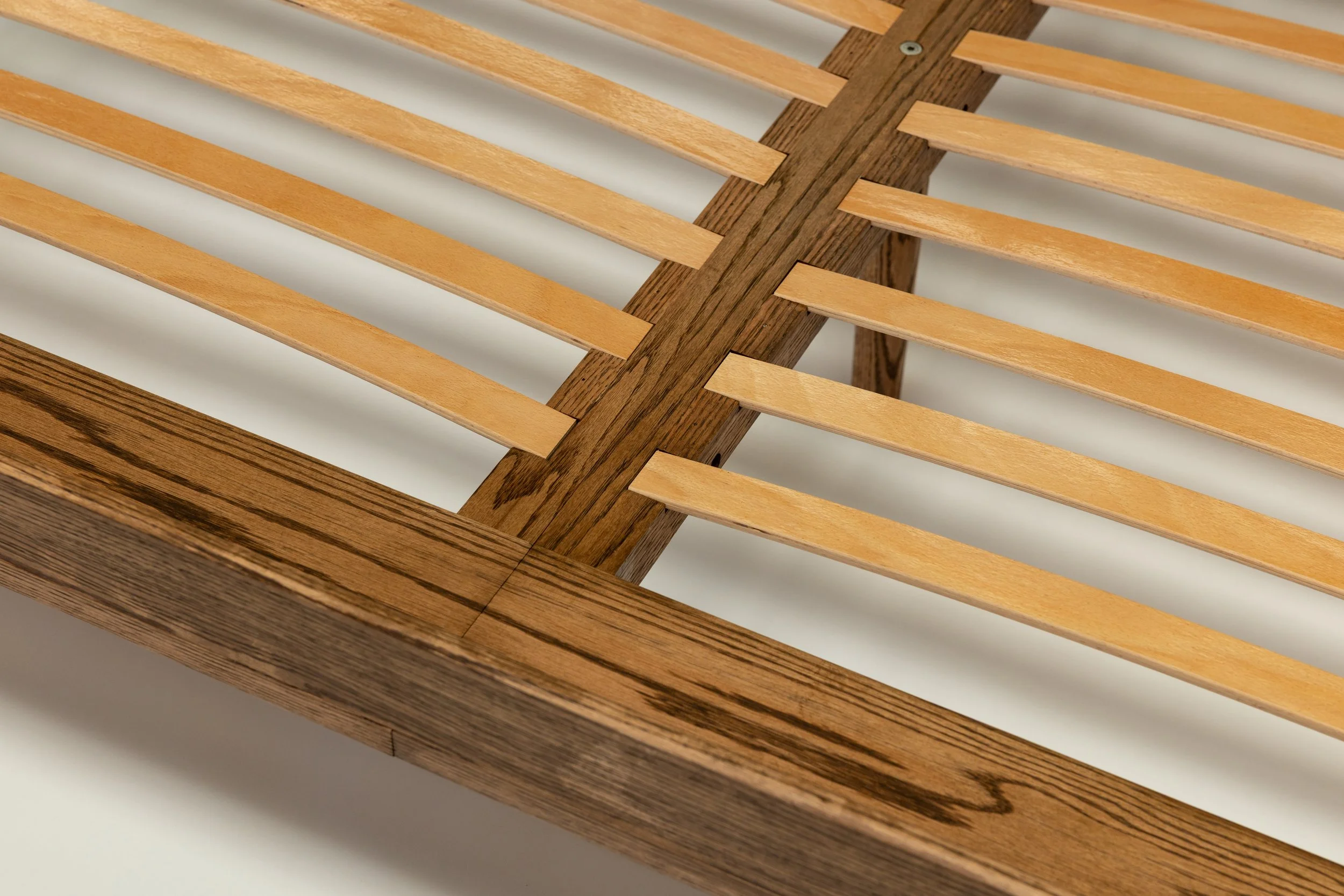 The bed is fitted with precision-shaped arched solid timber slats, engineered to provide consistent load distribution and resilient mattress support. The slats are evenly spaced to promote ventilation while reducing pressure points, contributing to improved comfort, structural performance, and long-term durability.