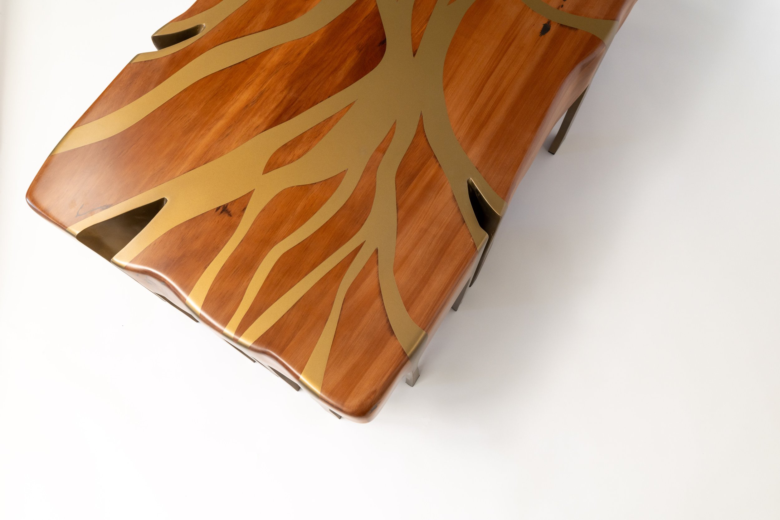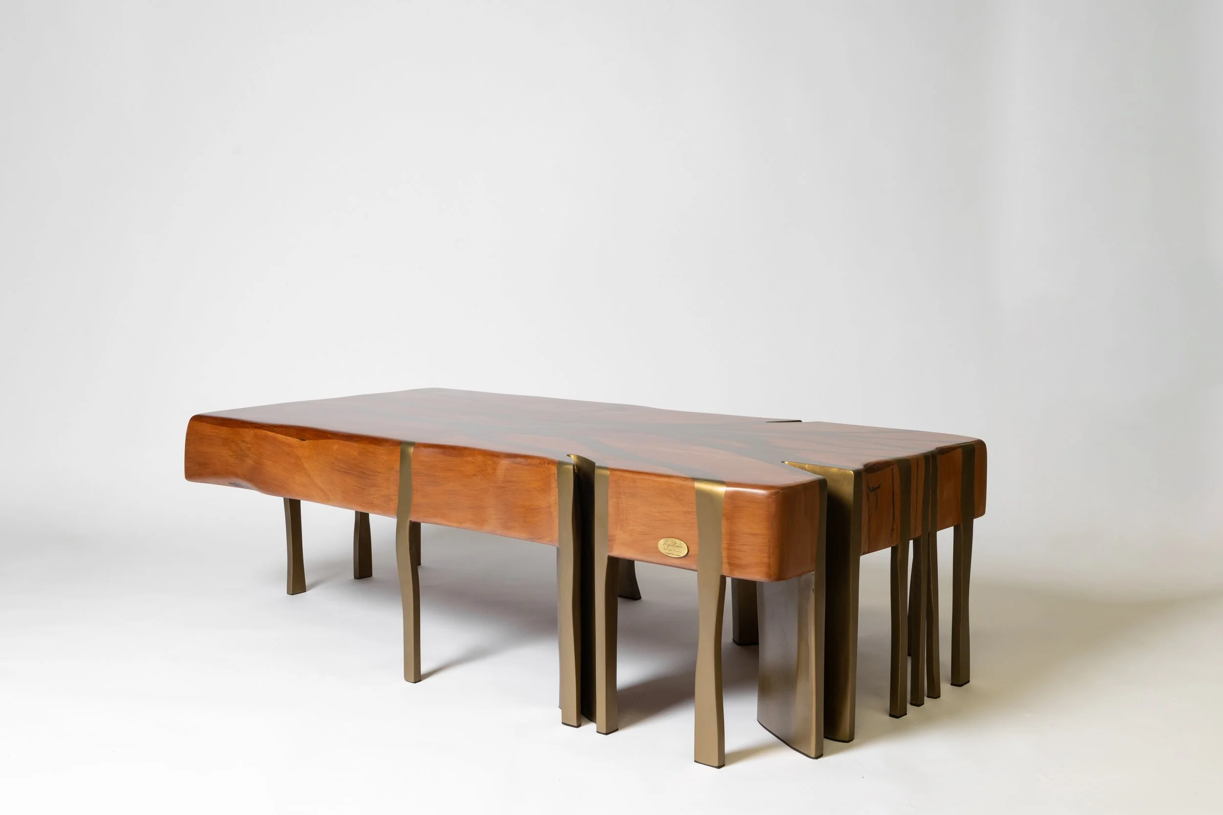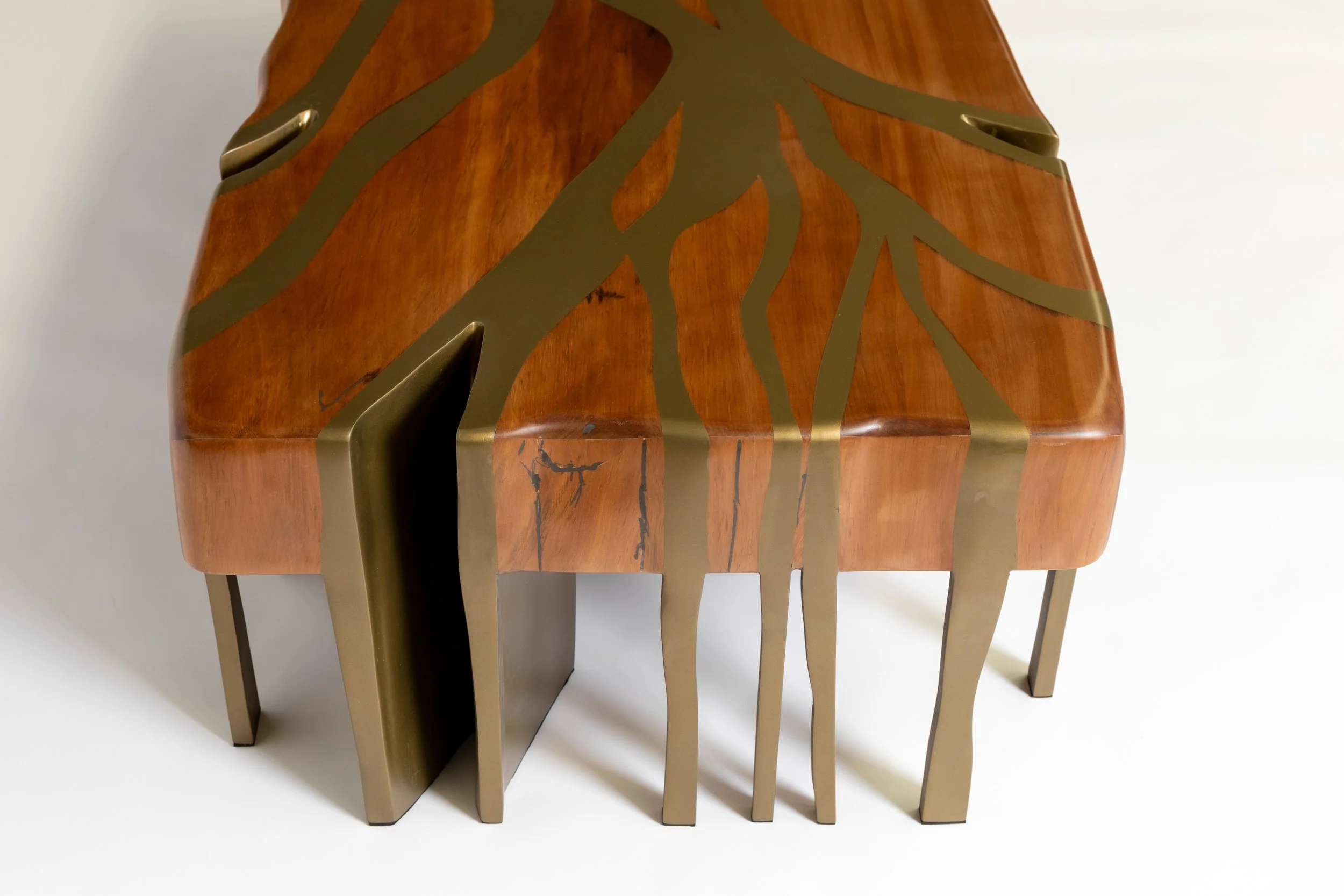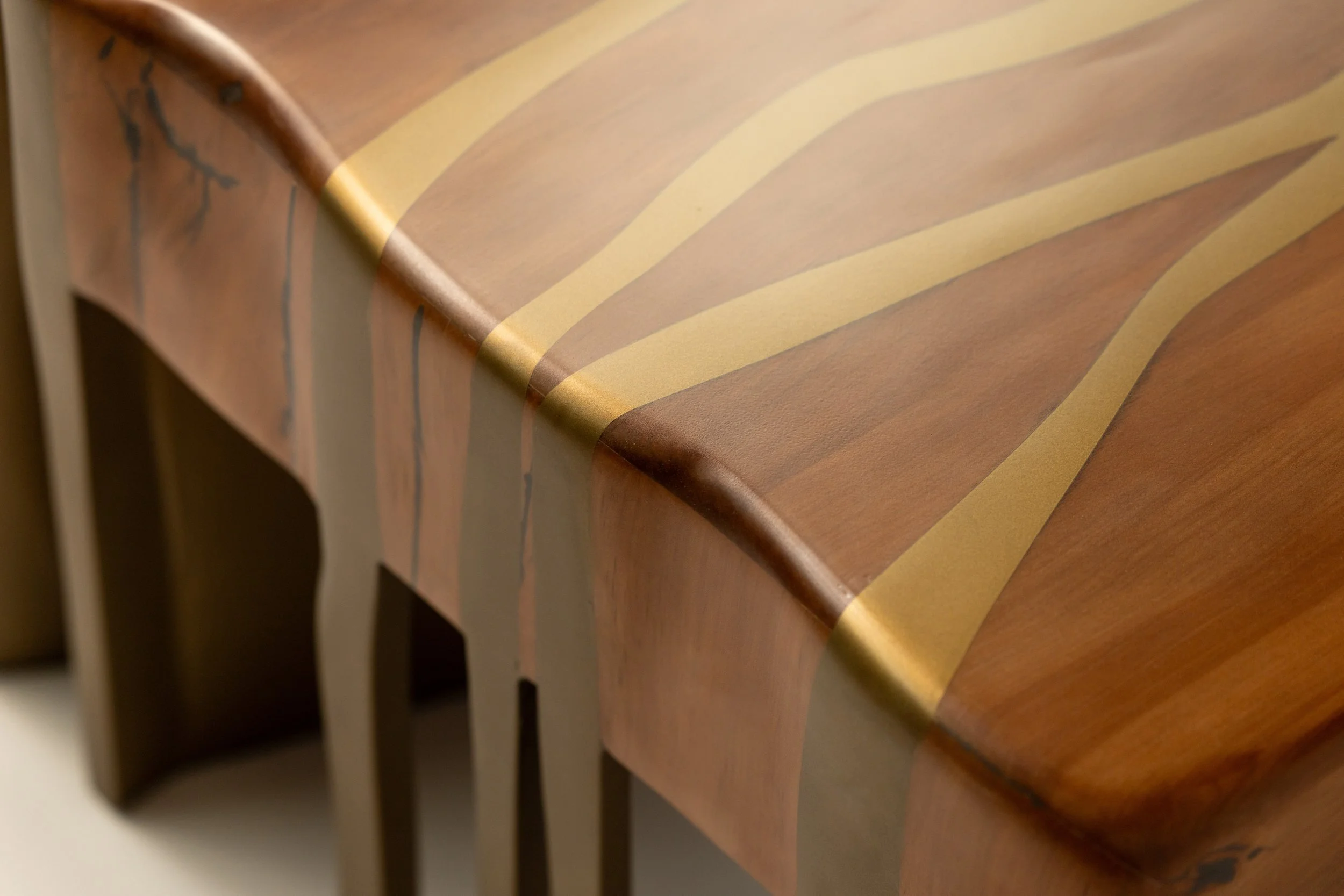Engineered with brass that flows through the length of the table, down through to the floor. The pouring over of the golden brass, creates a smooth transition to the ground.