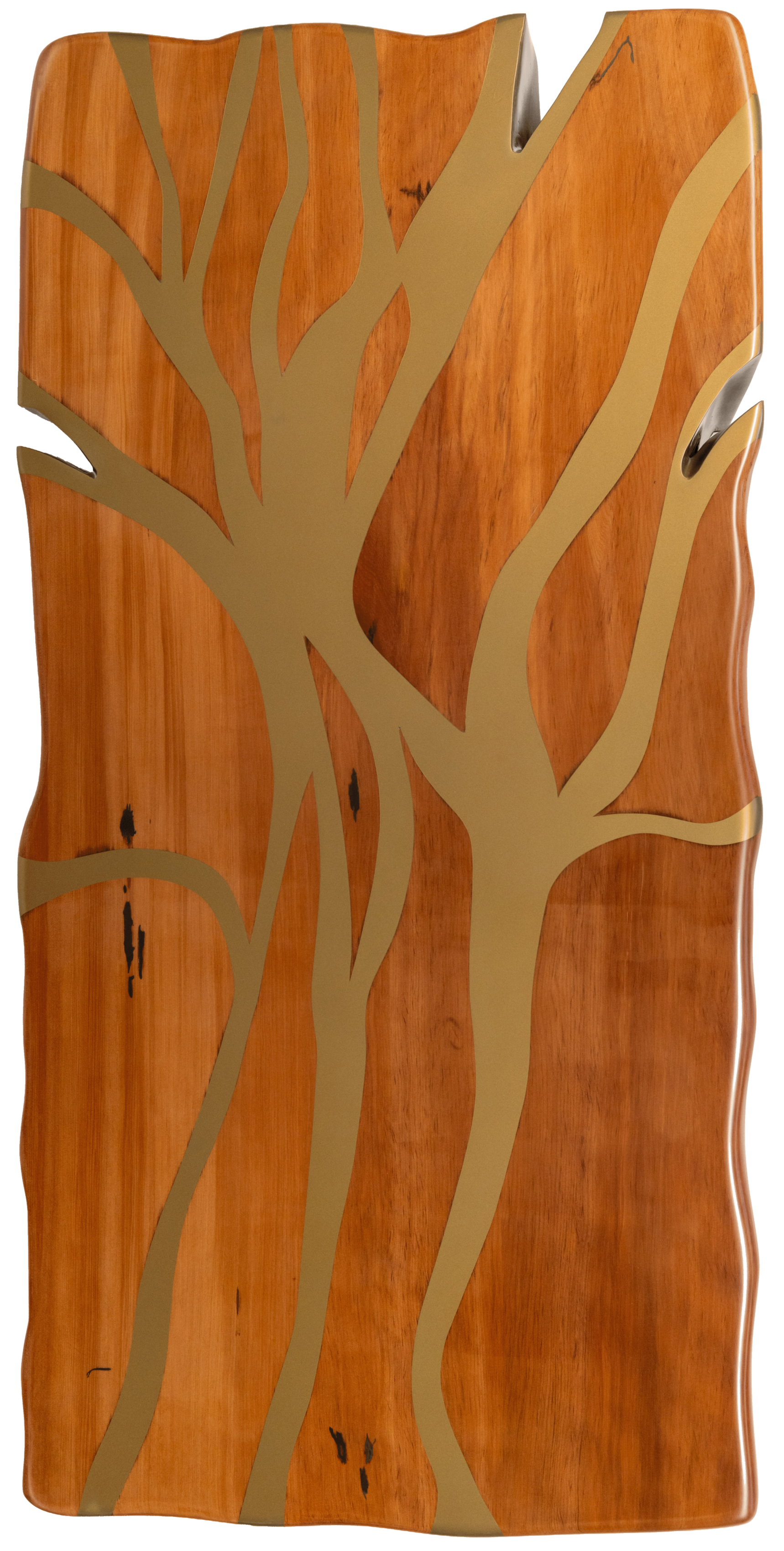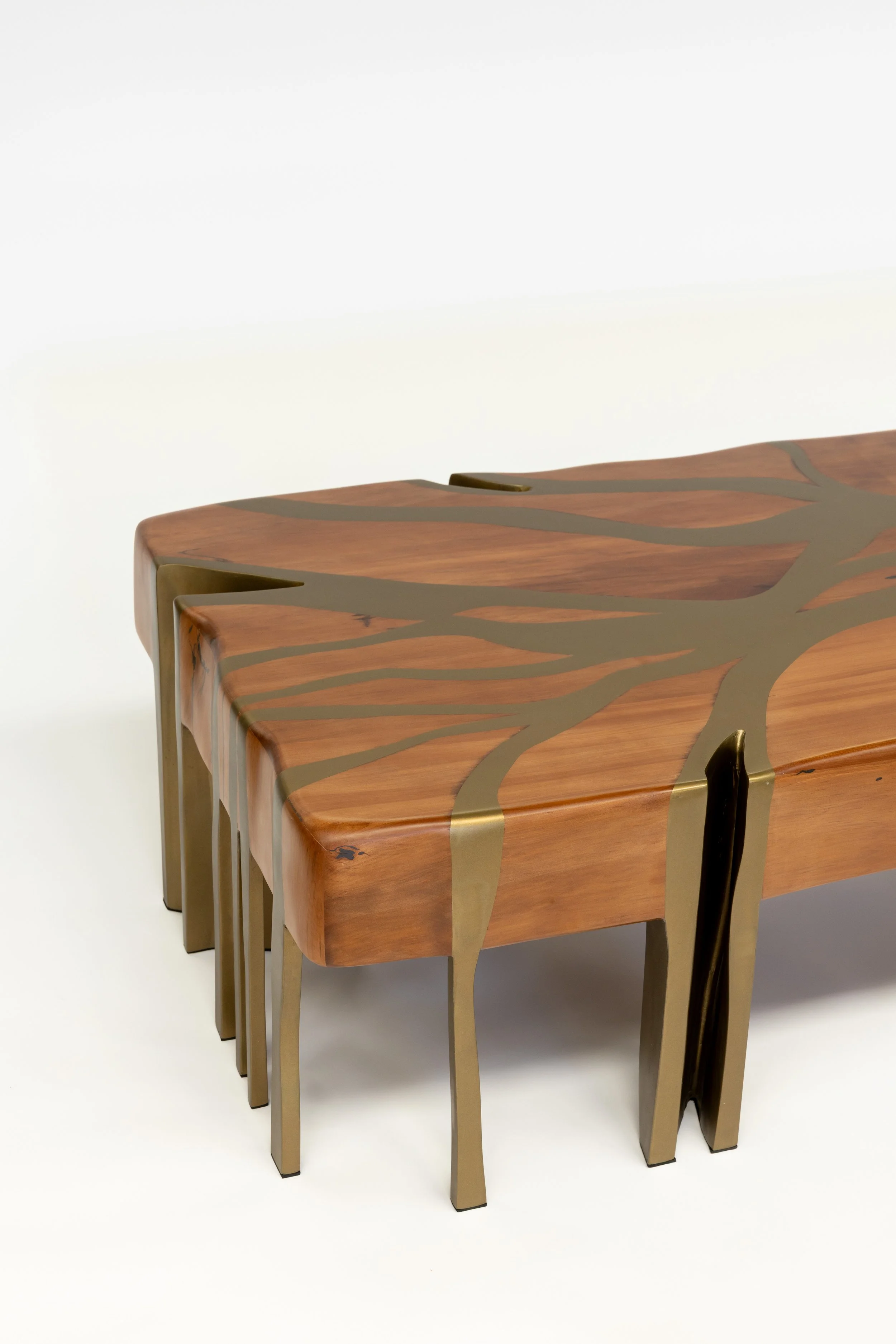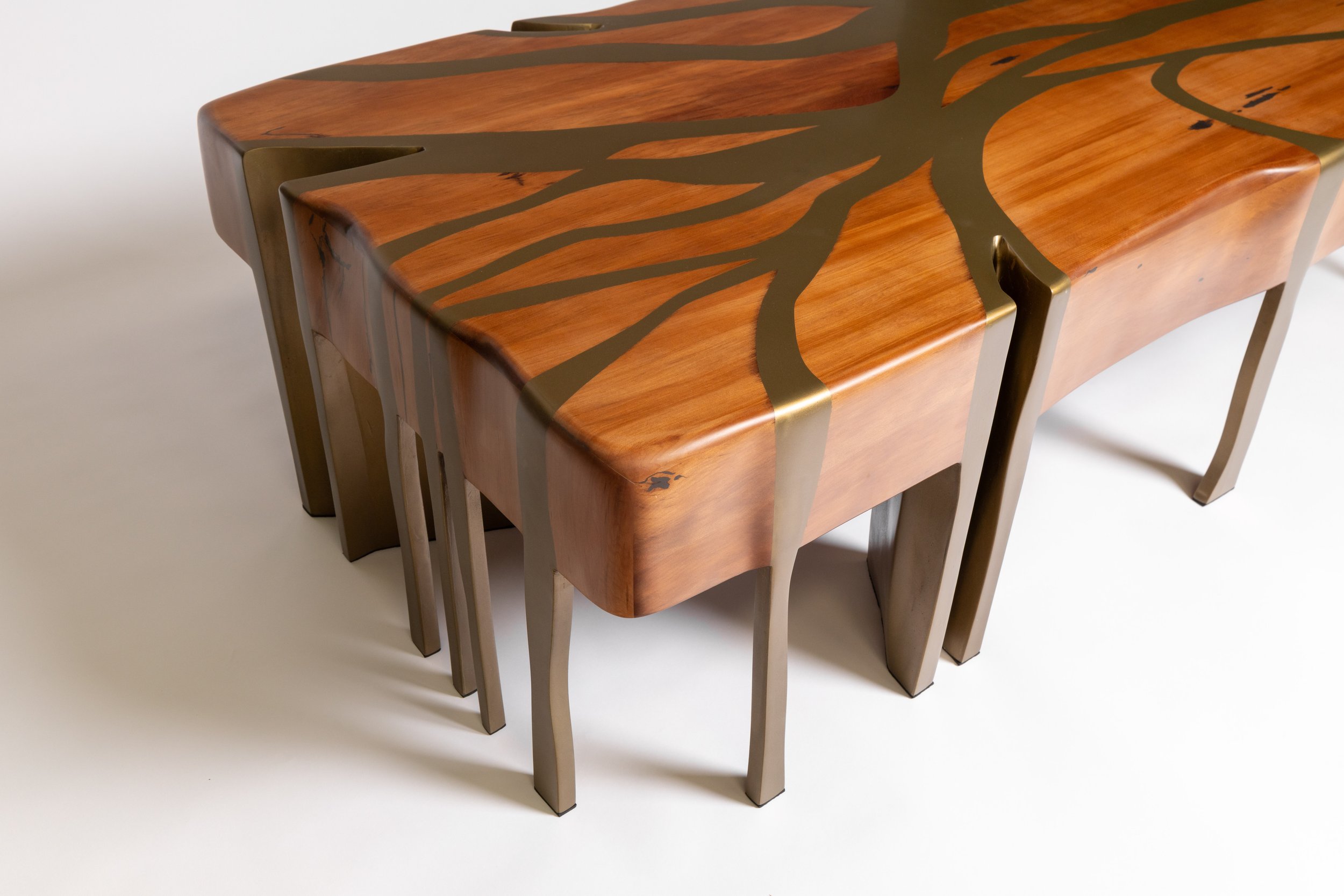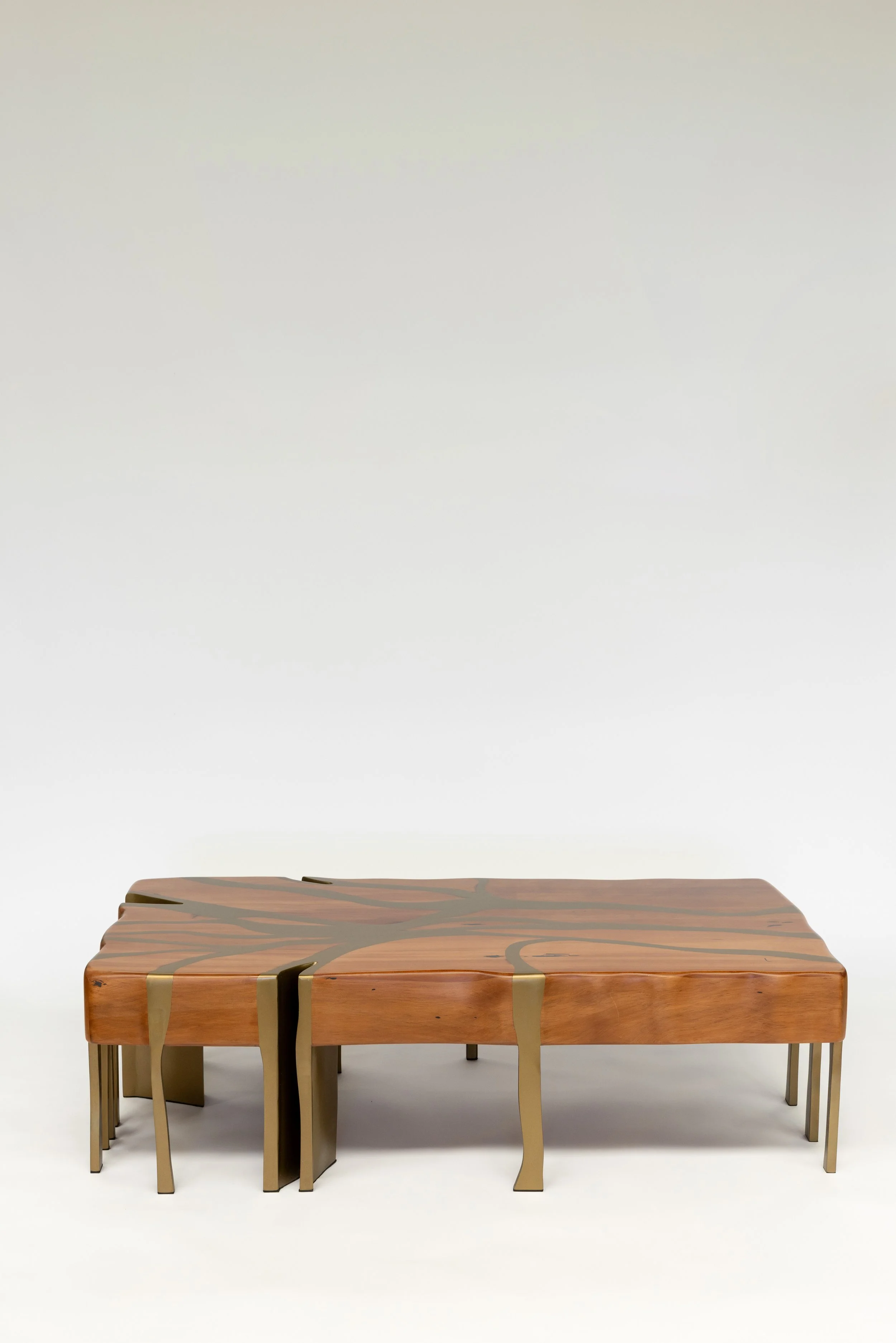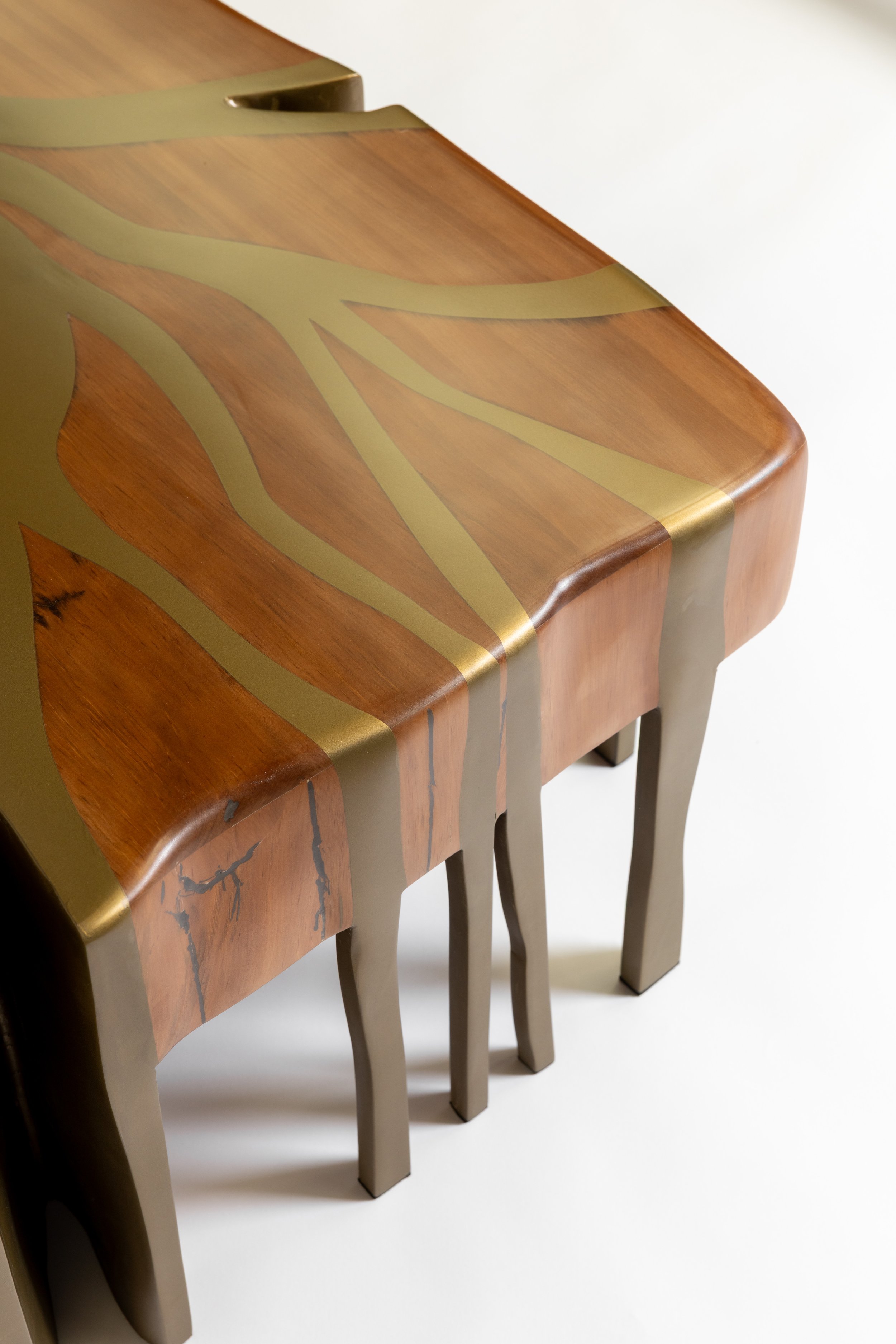 Engineered with brass that flows through the length of the table, down through to the floor. The pouring over of the golden brass, creates a smooth transition to the ground.